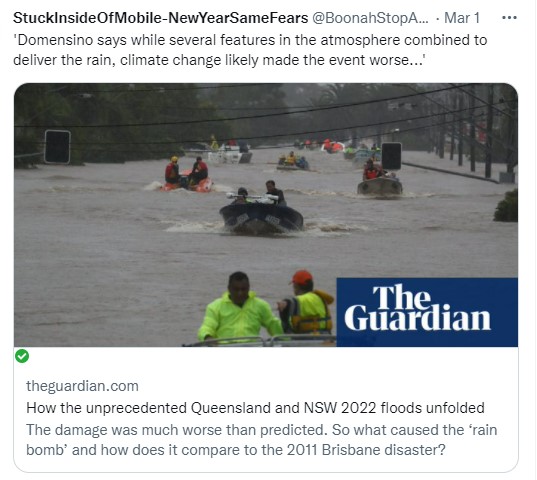 The Twitterati took to me a little – they rightly pointed out that NSW leaders like Dominic Perrottet and many in our fossil-fooled federal government have NOT made any link between these events and the existing global climate crisis which Eastern Australia is currently actively demonstrating. The Guardian article above agrees with them; politicians should not throw such dismissive and dangerously naive terms about…